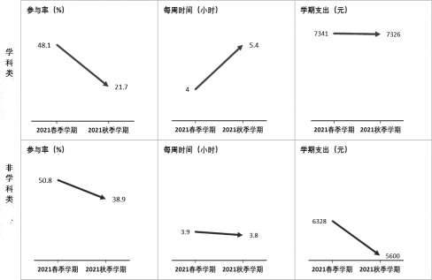 2021年秋季学期义务教育阶段学生参加非学科类校外培训的比率为38.9%,与上学期相比下降了10.9个百分点。这一部分参加非学科类校外培训的学生平均周用时3.8小时,比上学期少0.1小时;学期支出5600元,比上学期减少了728元。在时间和支出上与上学期相比都有所下降,但支出下降的比率更大。再一次体现出“双减”工作的落实不仅降低了校外培训的参与率,同时也推动了校外培训收费水平的下降。