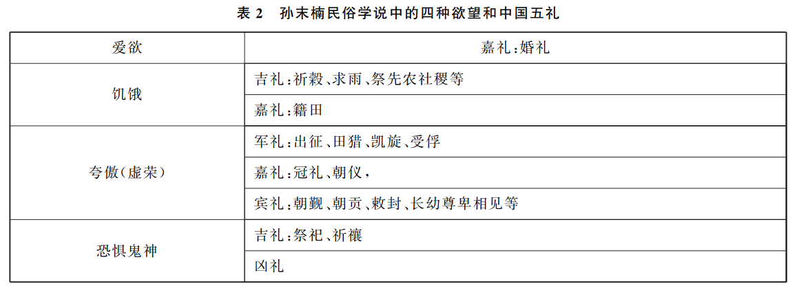 随后,他基本借用孙末楠关于德型的界定来定义礼,即礼是加以哲学的伦理的观念,认为与社会的福利有关的风俗,是一个社会用以满足人类的需要及欲望并且有着信仰、概念、规律及标准的行为法则。为了说明孙末楠关于德型的定义正好是中国的“礼”,如表2所示,瞿同祖还将孙末楠的四种欲望和中国的嘉、吉、宾、军、凶五礼进行了对应。对于礼是真理、正确的原理(principle)、相对固定等特征的分析,瞿同祖都取自于孙末楠。当然,他也对孙末楠的归纳有所修正,诸如中国的礼常经由儒生士大夫行之于文字,作为文化的礼需要有意识学习,等等。在对礼的辨析中,瞿同祖提到了“制度”。他认为从礼产生的制度,仍是用来满足欲望的成套的公共思想、行为方式与法则,只不过更系统、具体,更经过社会意识的鉴定而已。