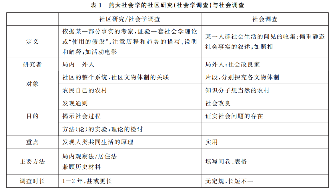 这样,我们可以把承袭自布朗基本定义、吴文藻化用和赵承信进一步完善的燕大社会学关于社区研究(社会学调查)和社会调查的关系认知简括如下(表1)。