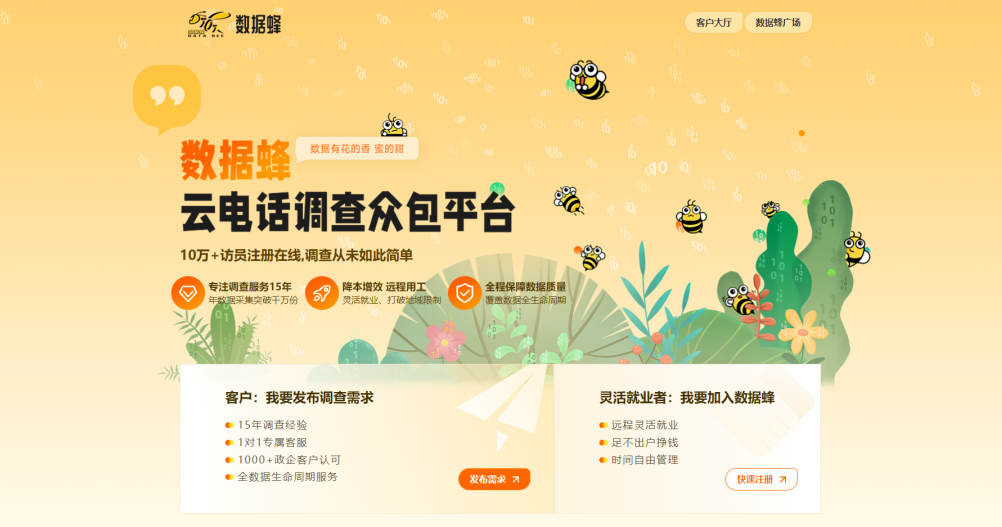 数据蜂网站主页正式上线!如果您想找人帮您完成问卷调查任务,又或者自己想开展电话问卷调查却苦于没有合适的电话调查系统,数据蜂都能满足您的需要!